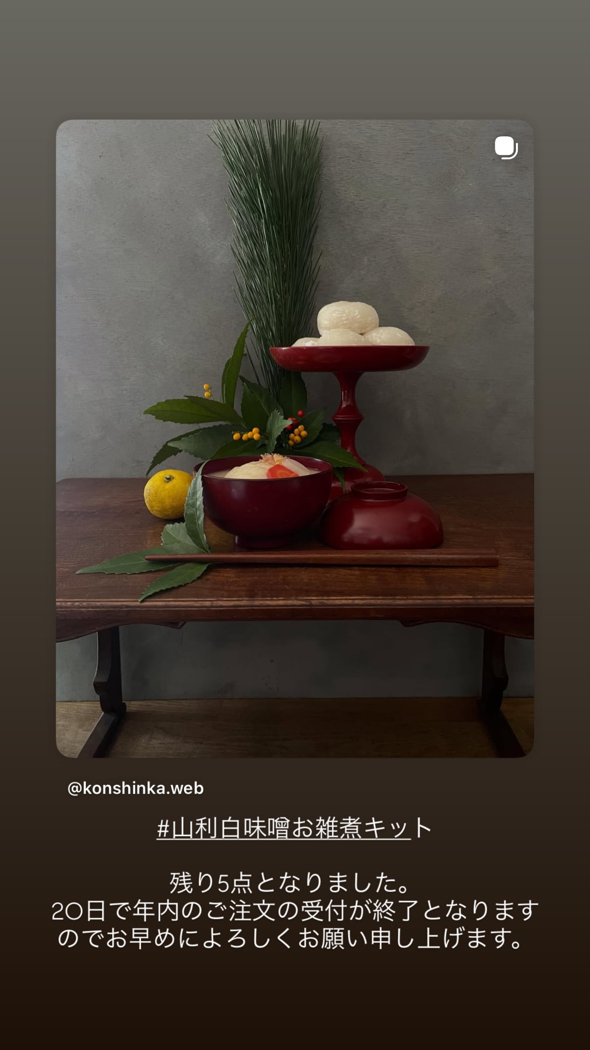 ◯ 26日分白菜キムチキット+送料 ◯山利白味噌お雑煮キット+ゆず茶キット2kg+金柑+梔子粉+百年草粉+松葉 送料 ◯木のお重と精進おせちキット+送料 ◯キムチキット+いりこ+九条ねぎ+送料 ◯冬A+なますの京人参と大根+送料
