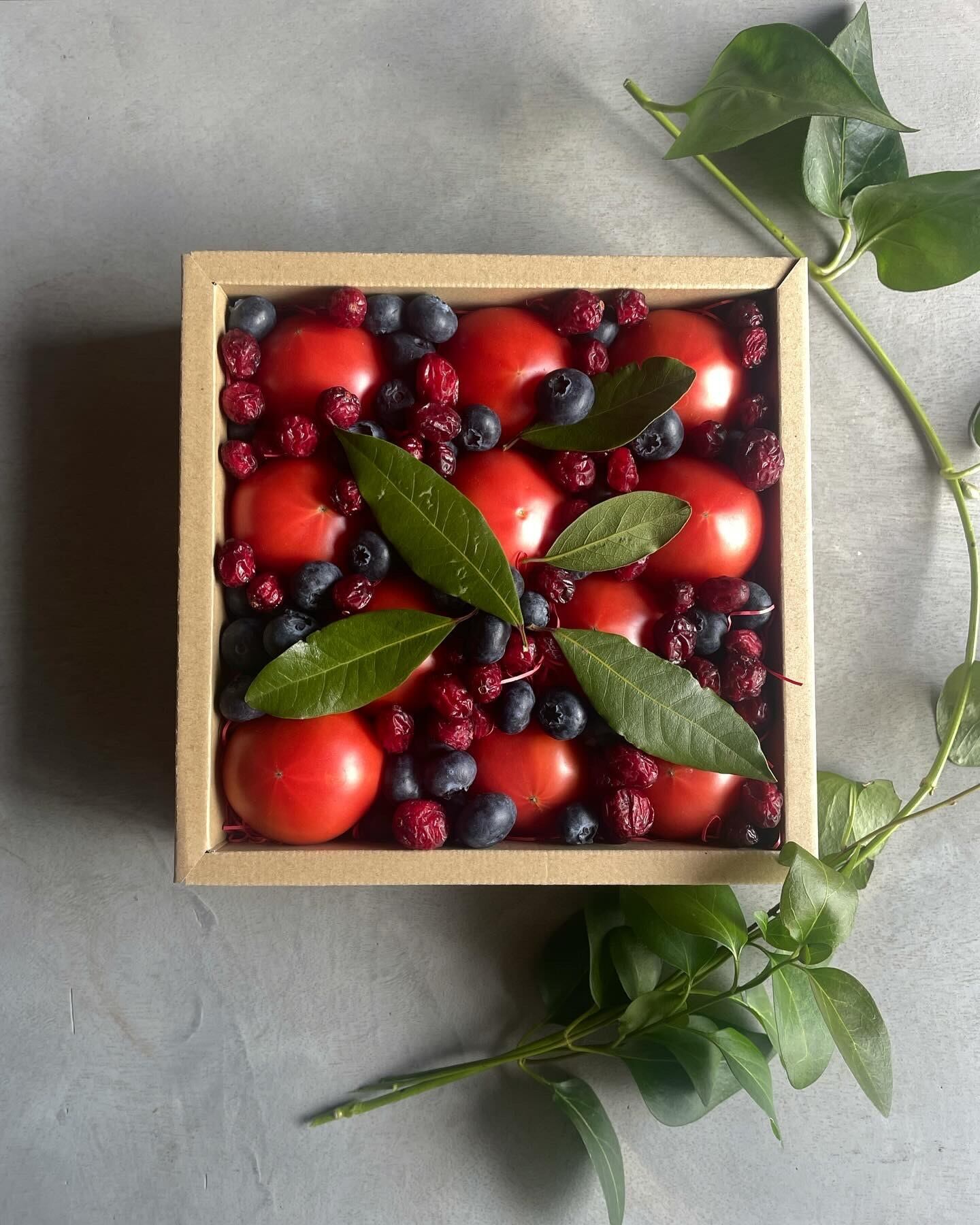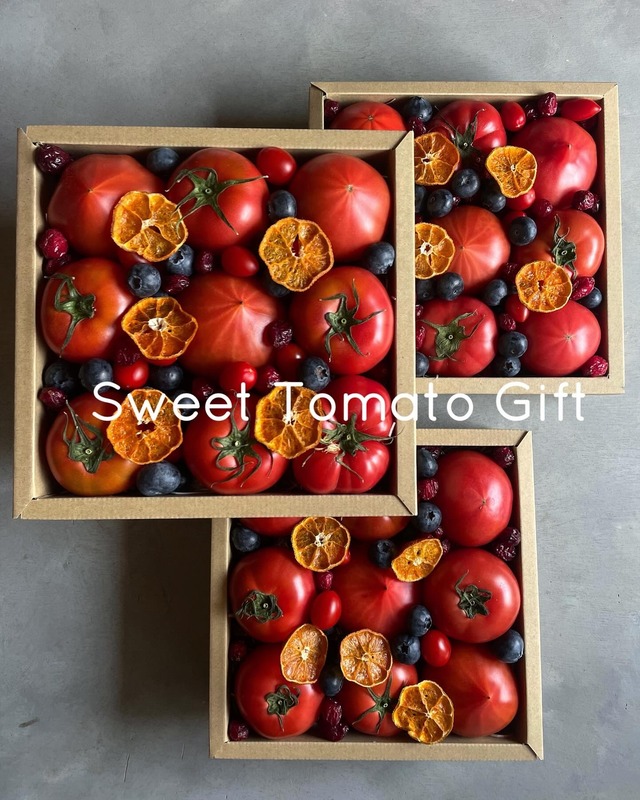 フルーツトマト約大9個もしくは約中11個とハーブ、季節の果物、オーガニックドライクランベリーを20cm正方形のスリーブBOXにお入れして全国へお届けいたします。